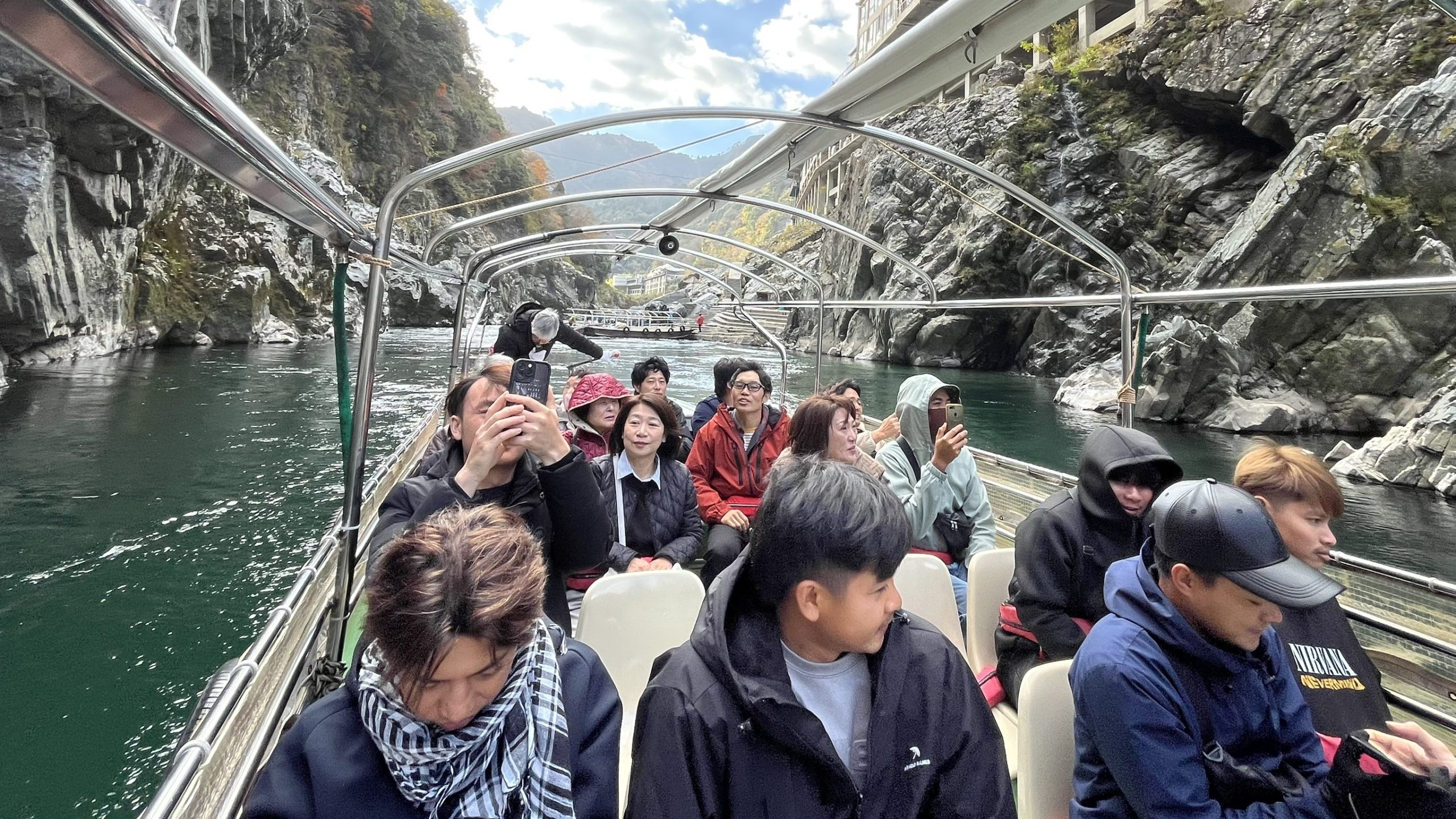 最初に、大歩危峡観光遊覧船に乗りました。到着して、周りの景色の良さに驚きました。水も綺麗で、船での時間はとても気持ちの良い時間でした。